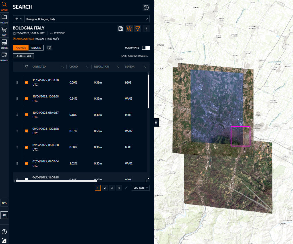 Alternatively, you can enable the ‘footprints’ option to display all image footprints on the map simultaneously, making it easier to visualize all available imagery within the AOI. When this option is active, you can click on a single footprint to view its content and associated metadata, or select multiple footprints at once to explore the information from several images simultaneously.