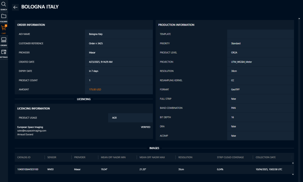 View Details – By clicking the “eye” icon, you can review all selected parameters and images, along with the calculated price. This information is organized under the sections Order Information, Production Information, Licensing Information, and Images.