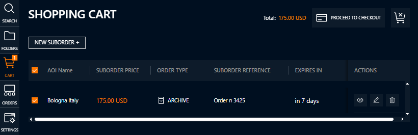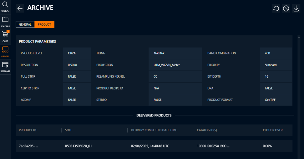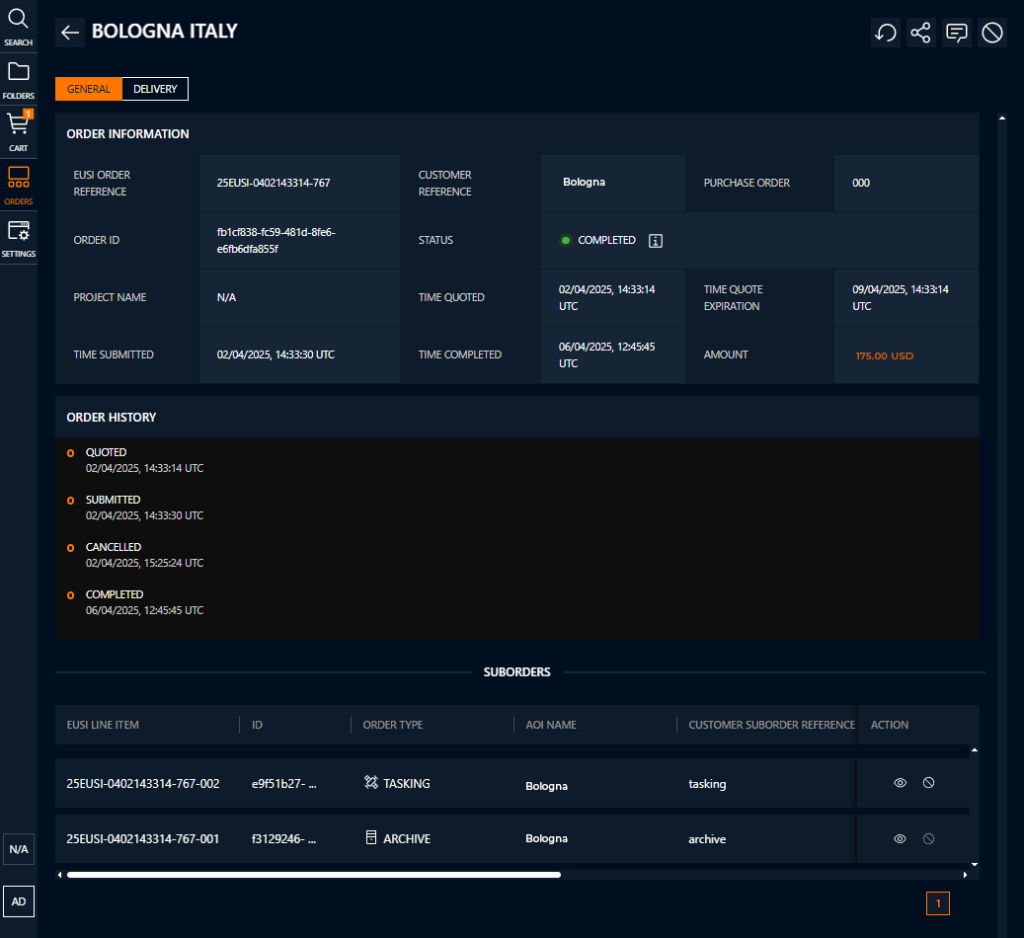For each suborder, you can choose to cancel the request or download the Area of Interest (AOI) in various formats.
