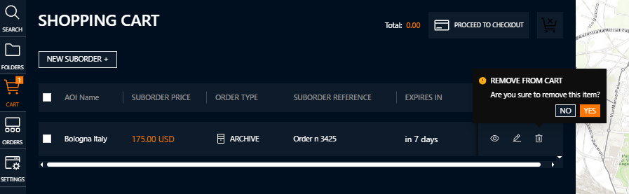 Remove Item from Cart – Clicking the “recycle bin” icon allows you to remove (cancel) the order from the shopping cart. A confirmation message will appear: