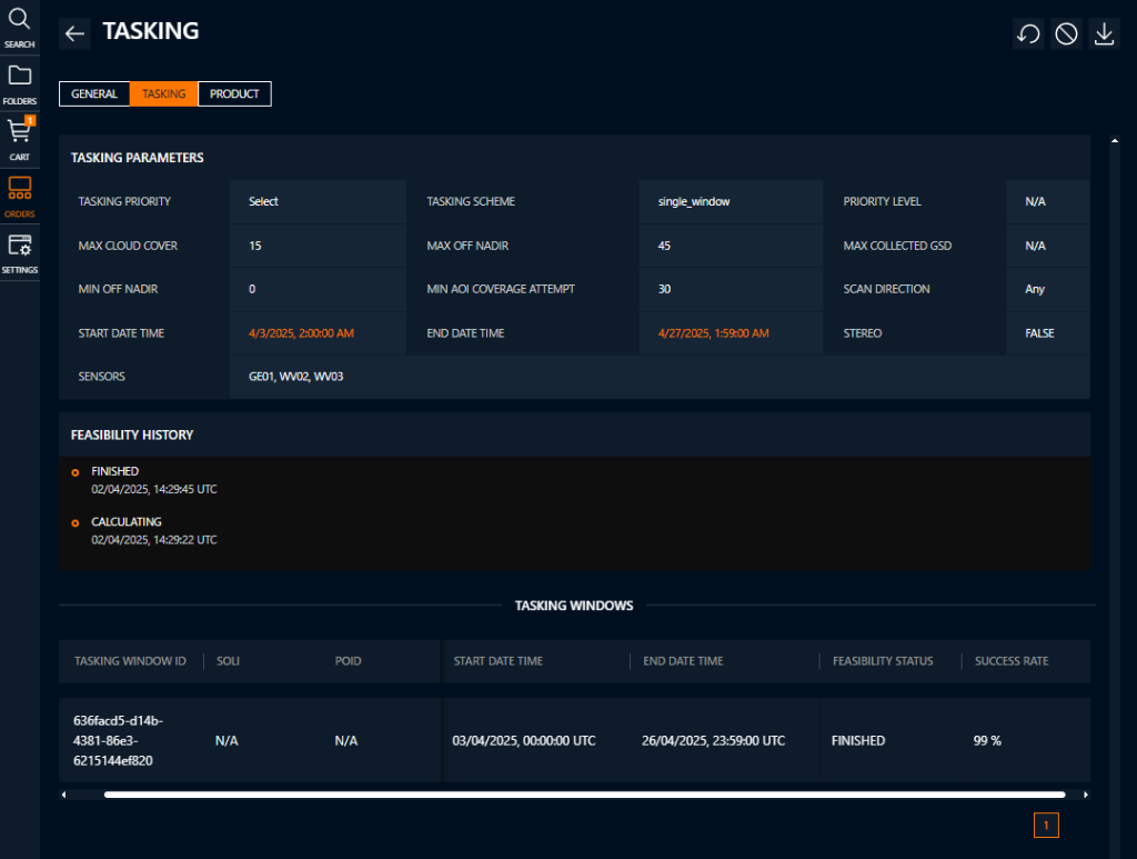 • Tasking – This tab provides access to the Tasking Windows, where each row represents a specific tasking window. These can be expanded to show acquisition attempts assigned to that window. Additionally, the Feasibility History is available in this tab.
